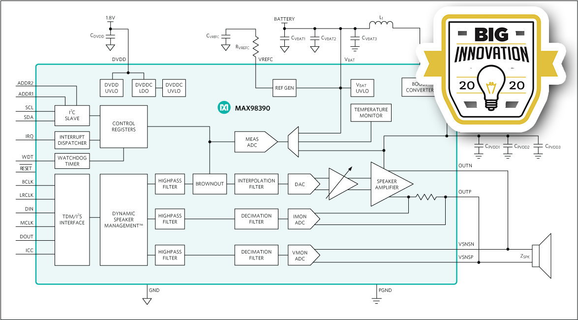 MAX98390은 부스트 컨버터, 다이나믹 스피커 매니지먼트(Dynamic Speaker Management™), FET 조절을 통합한 고성능 모노 D 클래스 DSM 스마트 앰프로, 낮은 출력 전력에서도 높은 효율을 실현한다.