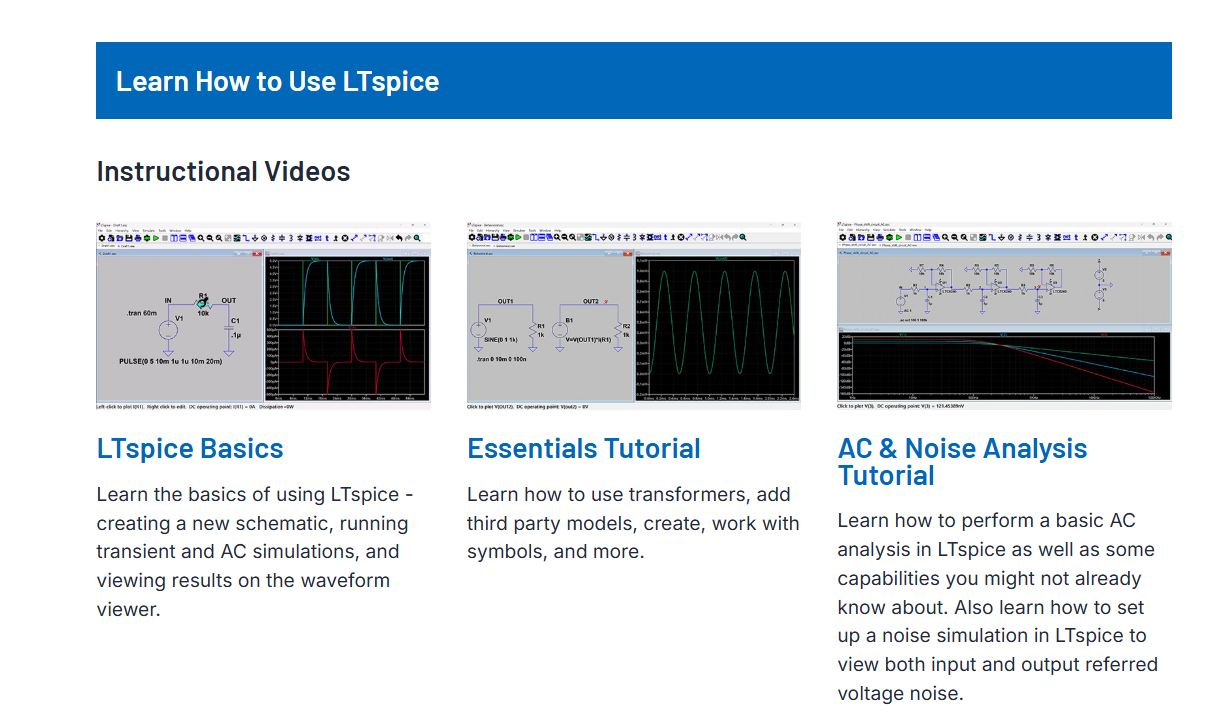 LTspice를 활용하기 위해서는 툴 자체에 대한 이해도와 기본 설정에 대한 학습이 필요합니다. ADI는 이를 위해 공식 홈페이지에서 다양한 교육 자료와 영상 튜토리얼을 제공하고 있어 엔지니어의 빠른 적응을 지원합니다. 또한, 시뮬레이션하려는 ADI Power·Analog 제품에 대한 LTspice 모델 파일은 제품 상세 페이지에서 바로 다운로드할 수 있으며, 제품별 Example 회로 파일도 함께 제공되어 즉시 시뮬레이션을 시작할 수 있습니다.