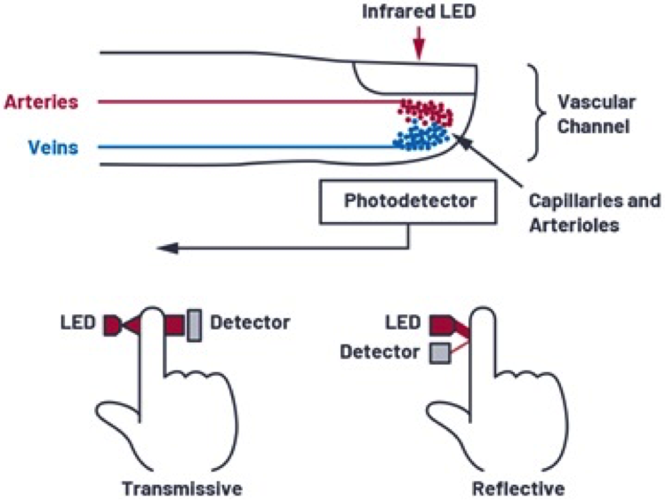 信號包含直流和交流分量。直流分量是由於皮膚、肌肉和骨骼以及靜脈血等不斷反射的物質造成的。當身體處於靜止狀態且運動不太重要時,交流分量主要包括來自動脈血脈動的反射光。AC 分量取決於心率和動脈厚度,收縮期(泵)的反射或透射光多於異位(鬆弛)。在收縮期,血液從心臟泵出,這會增加心房血壓。血壓升高會使動脈擴張並導致心房血容量增加。血液中的這種增加導致光吸收的增加。舒張期血壓下降,因此光的吸收也下降。
