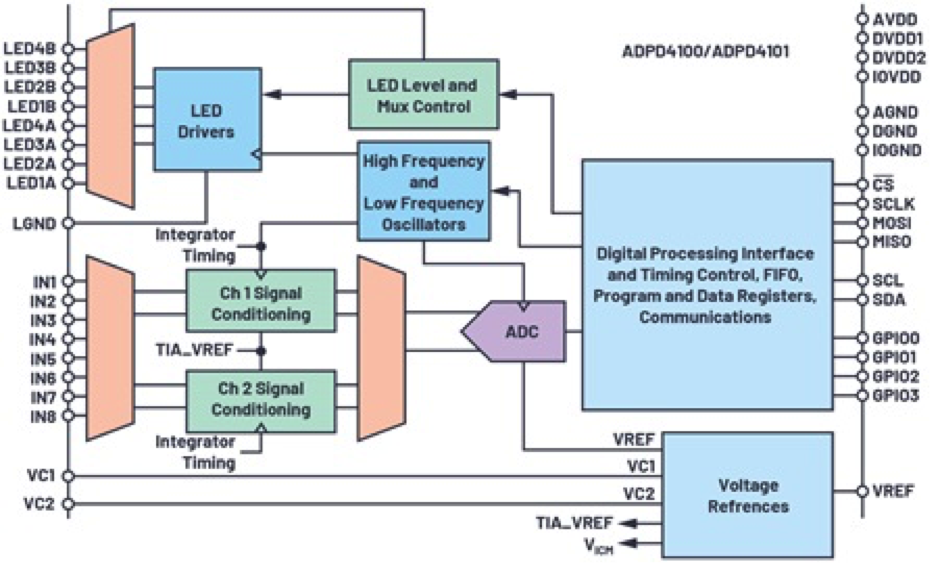 ADPD4100 和 ADPD41001 可實現高達 100 dB SNR。這種增加的動態範圍對於在低灌注情況下測量 SpO 2至關重要。這種集成的光學 AFE 具有八個板載低噪聲電流源和八個獨立的 PD 輸入。數字時序控制器具有 12 個可編程時序槽,使用戶能夠定義具有特定 LED 電流、模擬和數字濾波、集成選項和時序約束的 PD 和 LED 序列陣列。