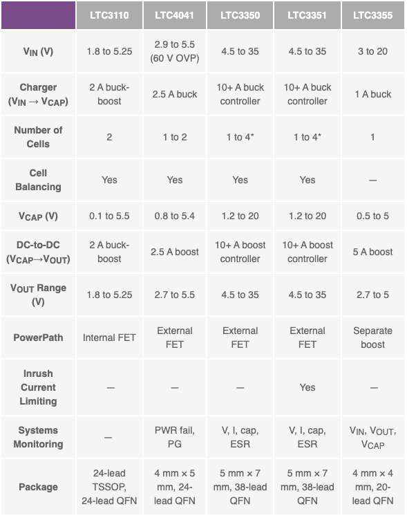 ADI公司擁有一系列廣泛的整合解決方案,這些解決方案集成了所有必要的電路,可在單個IC中涵蓋備份系統的基本功能。表2總結了ADI公司一些超級電容充電器的特性。