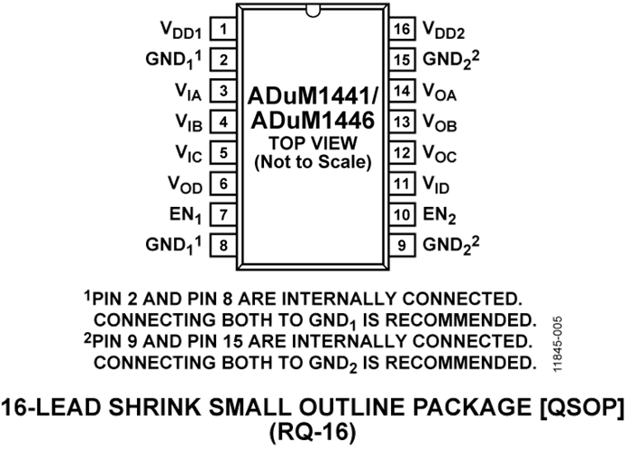 ADuM1440/ADuM1441/ADuM1442/ADuM1445/ADuM1446/ADuM1447系列四通道2.5千伏數位隔離器裝在小巧的16引腳QSOP和20引腳SSOP封裝中,相比於封裝在寬體SOIC封裝中的隔離器,可以省下近70%的板子空間。