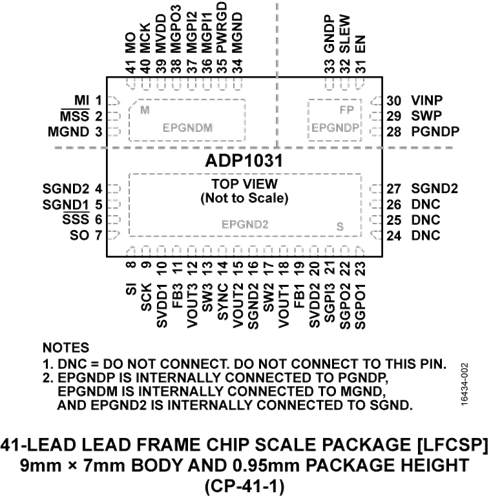ADP1031 採用 9 mm × 7 mm,41 引腳 LFCSP 封裝,額定工作溫度範圍為 −40°C 到 +125°C。