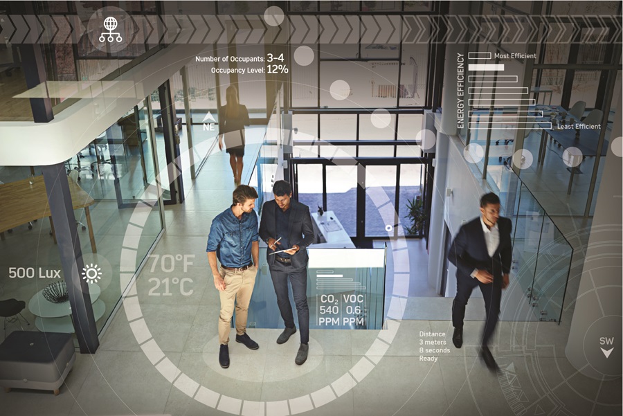 此外,員工生產力有可能因空氣品質不佳而受到負面影響。產業界針對這領域的研究,結果顯示員工在良好室內環境品質的建築工作時,所得到的效率會比在傳統建築中工作要高出10%。在這方面,物聯網裝置也可用來量測與檢查空氣品質,以及運用各種以網狀網路互連的感測器來量測大氣中的二氧化碳濃度。這些裝置都連結到建築基礎設施的所有區域,進而構成一種方法,藉以讓環境以及每個人維持健康與生產力。