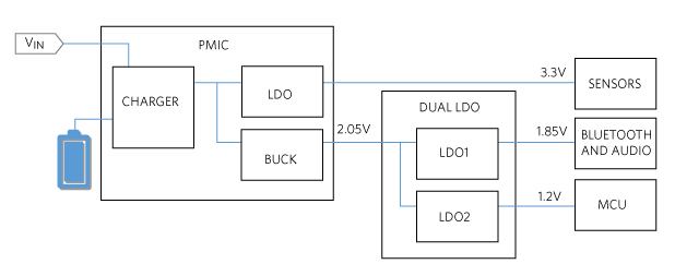 圖2展示了可聽戴音頻設備的典型電力流程,其中採用LDO驅動對噪聲敏感的元件。
