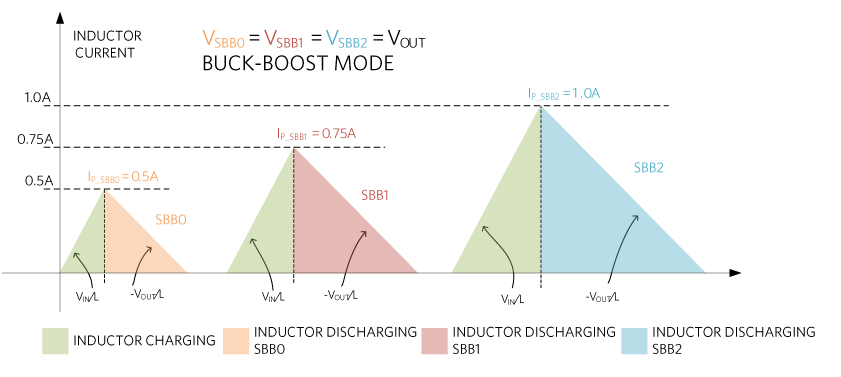 圖3顯示了SIMO拓撲的簡化圖。圖4顯示了SIMO操作的電感器電流波形示意圖。SIMO採用不連續電流控制模式。在MAX77654 SIMO中,它可以在降壓或降壓升壓模式下運行,以支持0.8V至5.5V的廣泛輸出範圍。例如,在降壓升壓模式下,電感器通過M1和M4的導通以VIN/L的速率建立電流進行一個周期。當達到為所服務的輸出軌道編程的相應峰值電感器電流限制時,電流隨後通過M2和M3.x晶體管傳遞到該軌道。