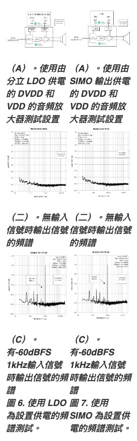 圖6(a)顯示了使用兩個離散LDO為DVDD和VDD供電的音頻放大器的設置;相比之下,圖7(a)顯示了使用SIMO的三個輸出軌道之一為DVDD和VDD供電的相同音頻放大器。以揚聲器圖標表示的負載是由串聯一個32Ω電阻和一個15µH電感器實現的。