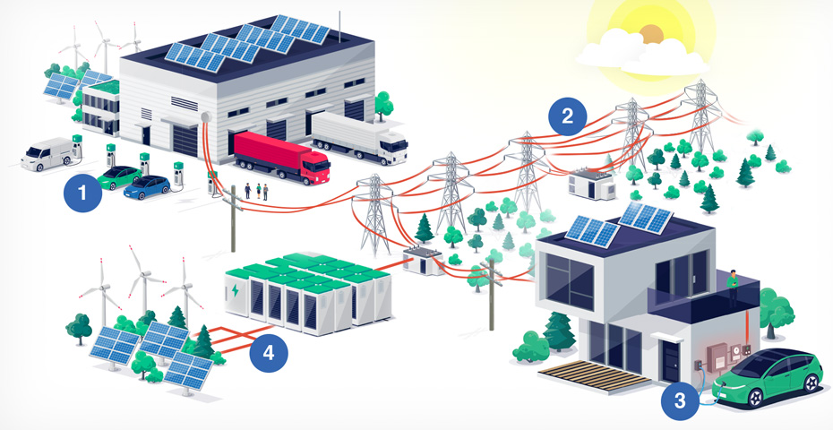 電動汽車的興起對電網的管理方式有重大影響。首先考慮電氣負載。1.25億輛電動汽車的最大負載約為10 TWh。這與世界總發電量的預期增長(從25,000到28,000 TWh)9相比很小,但當電動汽車在基礎設施內部移動時,其負載在時間上和空間上都有獨特的動態性。因此,不僅要求能夠處理總負載,還必須進行實時管理,從而向電網上的所有電氣設備無縫且零中斷地輸送電力。