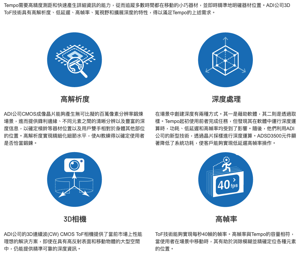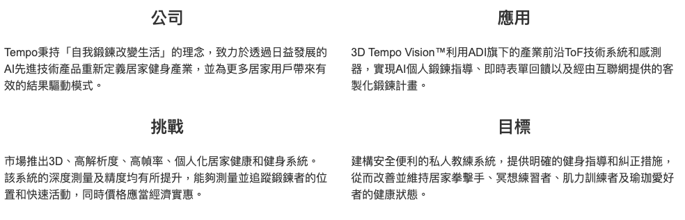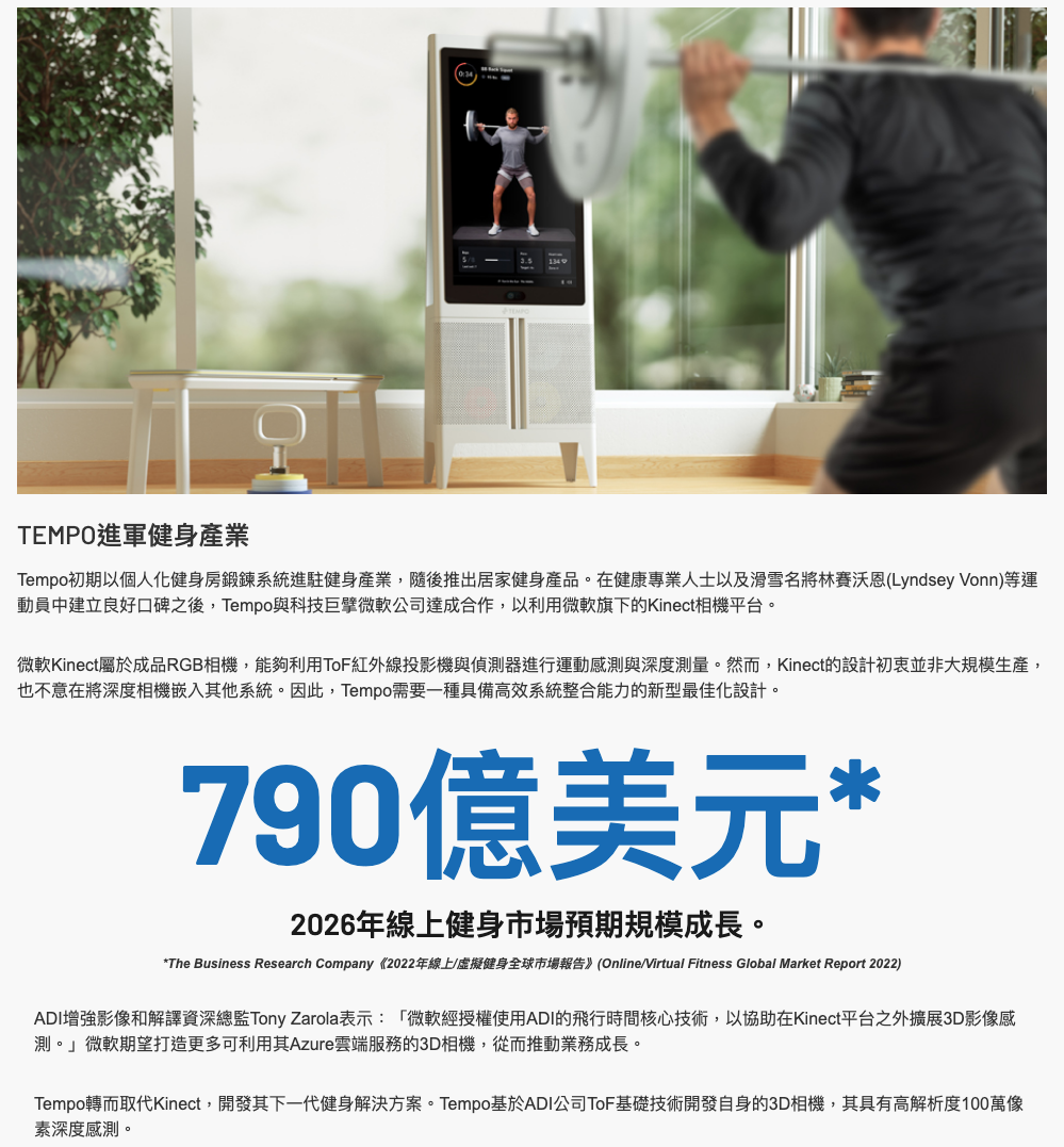 Tempo硬體副總裁Kailash Hiremath表示:「我們感謝ADI在產品開發過程中所提供的技術專長及支援。憑藉ADI公司的先進技術,我們得以將下一代Tempo 3D Vision推向市場,為客戶創造市場前沿的健身體驗。”