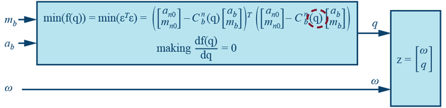 其中沒有來自羅盤的訊息。由於ω是角速率,我們只能使用四元數來導入羅盤資料q . 我們使用MSE方法來獲得q , 即觀測變數中的組分。