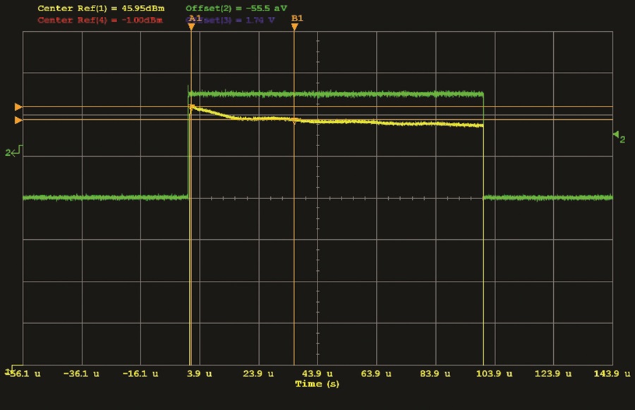 圖 5. 在 8990B 峰值功率分析儀上測量 ADPA1106 GaN PA 的典型脈衝。綠色跡線是放大器漏極電壓。黃色跡線是擴大機的射頻輸出。