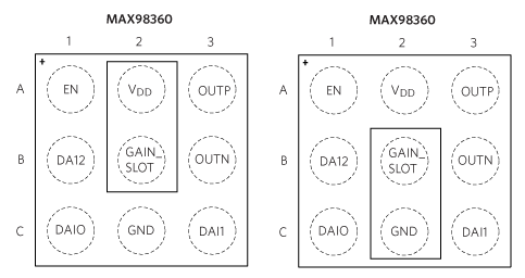 該 IC 還有一些其他顯著的優點,有助於最大限度地減少電路板尺寸/成本。首先,它採用微型 1.9mm 2 9 引腳 WLP 封裝,具有巧妙的引腳佈局,旨在消除昂貴的電路板通孔的需要。如圖 4 所示,GAIN_SLOT 引腳(位於封裝的中心)可以方便地連接到 V DD或 GND(直接連接或使用電阻器)或保持未連接,以提供 I²S/左對齊增益設定如表1所示。