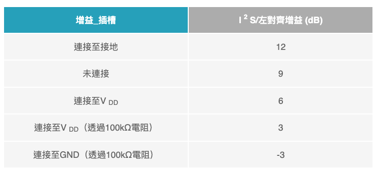 表1. MAX98360的I²S/左對齊增益設定。