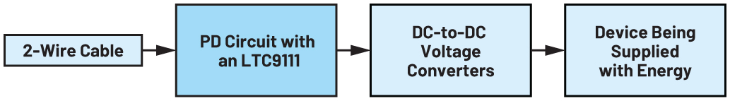 圖3顯示了一個使用LTC9111的PD接收器電路的框圖。能量來自於2線電纜。PD電路負責對線路傳輸進行分類和監控。分類指定了能量傳輸所操作的功率級別。如果操作的電氣設備需要除了24伏或55伏之外的電壓,則需要使用額外的DC至DC轉換器。