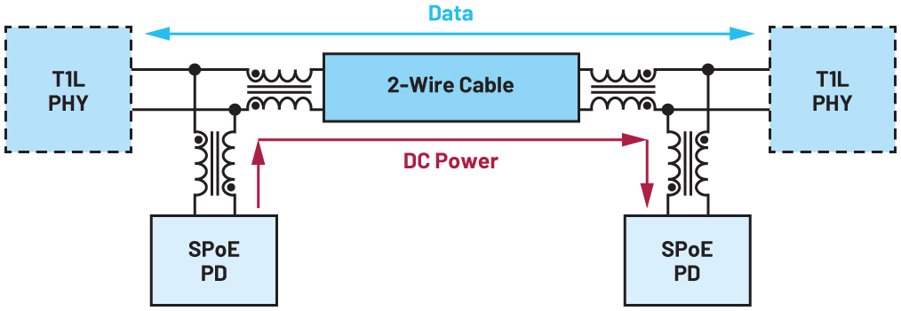 與PoE一樣,SPoE可以用於數據和電力傳輸。這是重要的,因為遠程電子設備通常需要電力和數據連接。圖1顯示了這一點,其中包括了T1L PHY。