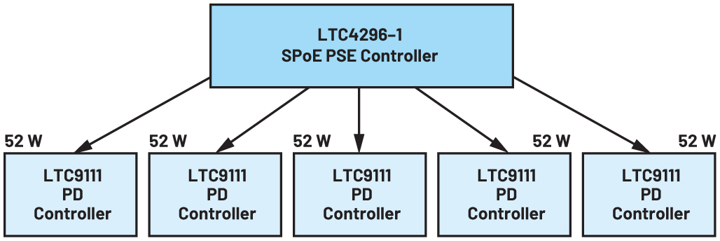 圖2. 一個LTC4296-1 SPoE供電設備(PSE)控制器,適用於驅動高達五個通道。