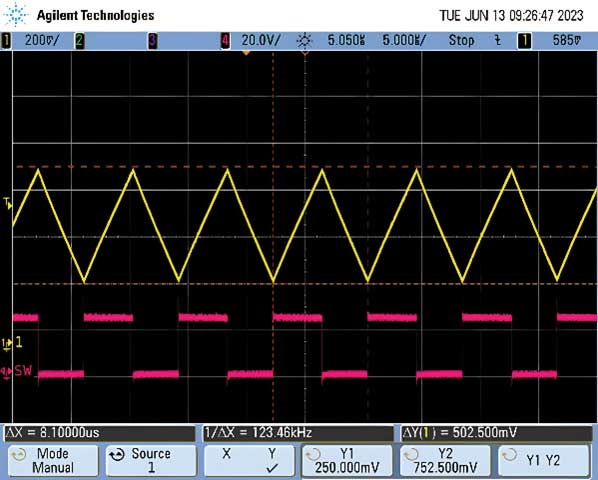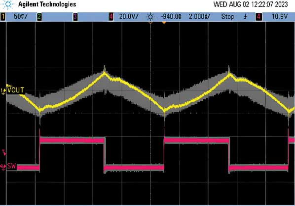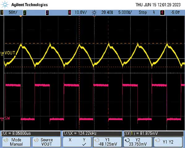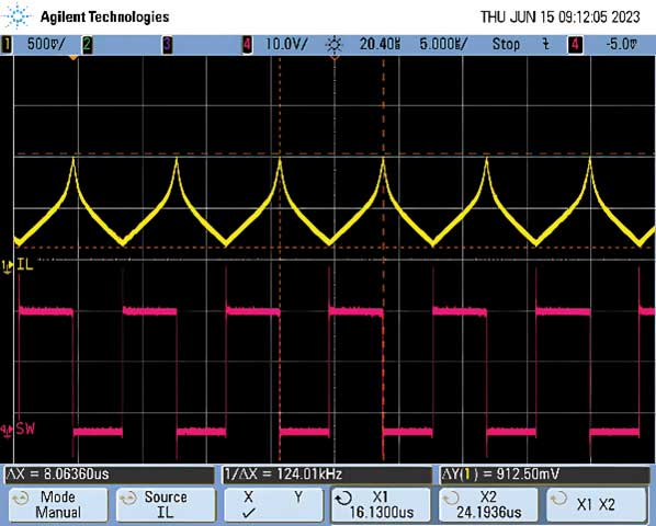 為了緩解此問題,設計師需要牢記,輸出電壓紋波可以通過改變所選擇的輸出電容器來控制。通過增加輸出電容器的值或降低其等效串聯電阻(ESR),可以減少輸出電壓紋波,而無需增加電感的值。這將使電感電流紋波保持在30%至40%之間的值,從而使感測架構能夠正確獲取訊號。這可以在圖15中看到。