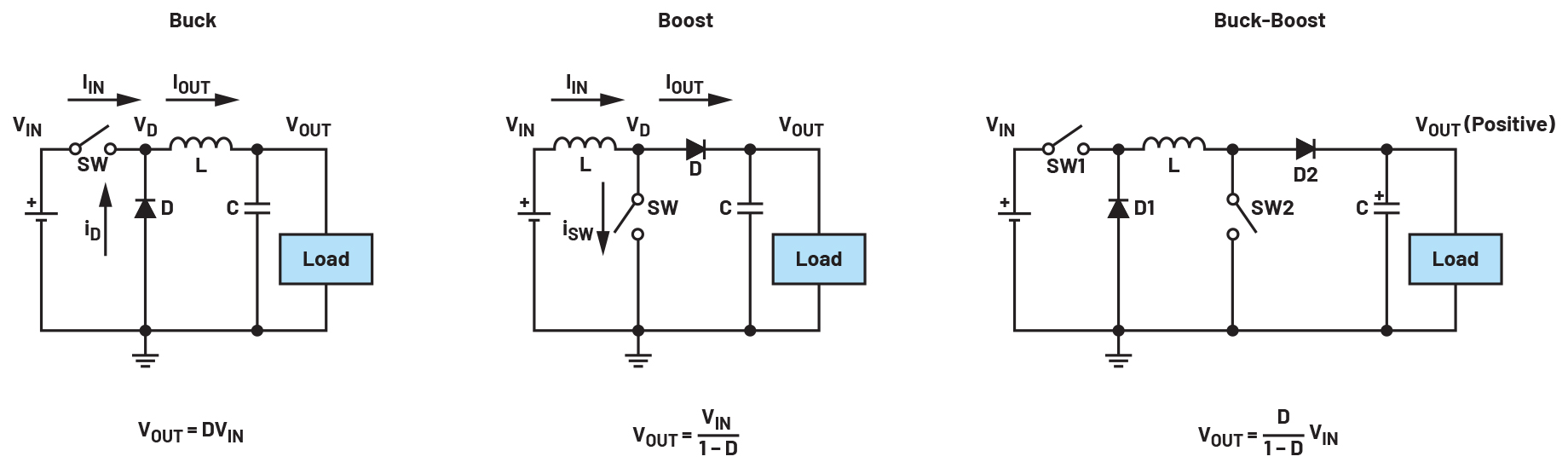 是一種高效率的調節器,可以將輸入電壓降壓(降壓轉換器)、升壓(升壓轉換器),或者兩者兼而有之(降升壓轉換器)。常見的開關式轉換器拓撲結構如圖1所示。