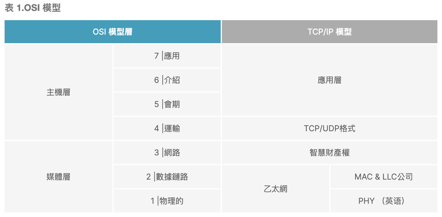 實體層指定電訊號的類型、訊號速率、媒體和連接器類型以及網路拓撲。乙太網路 PHY 可以對應到其上,如表 1 所示。