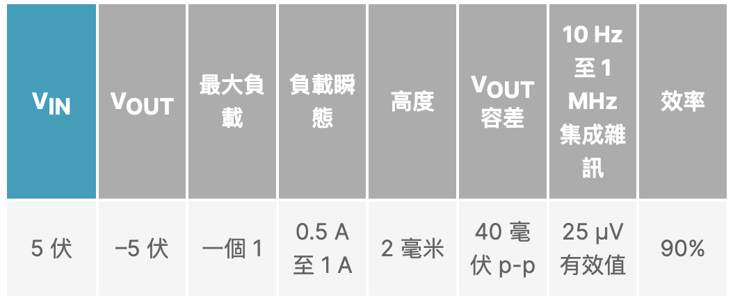 在以下應用中,功率放大器需要 -5 V 的負電源電壓。該導軌將由 5 V 電源供電,必須遵守 2 mm 的扁平高度限制,同時保持緊湊的外形尺寸。表 1 提供了完整的詳細規格清單。將 LT8624S 用作 IBB 是該應用的理想解決方案,因為它具有速度和低頻雜訊性能,可在保持良好效率的同時實現緊湊的解決方案尺寸。原理圖如圖 1 所示。