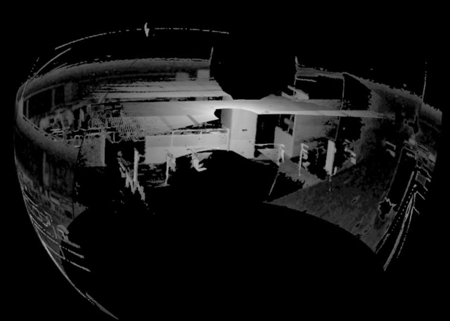 使用圓柱形投影演算法(也稱為前視圖投影)將FOV的組合點雲投影到2D畫布上(參見圖 4)。換句話說,該演算法將合併點雲的每個點投影到 2D 平面中的一個圖元上,從而產生覆蓋所有感測器組合視場的單個連續全景圖像。這將產生兩個 2D 拼接圖像:一個用於拼接 IR,另一個用於投影到 2D 平面上的拼接深度圖像。