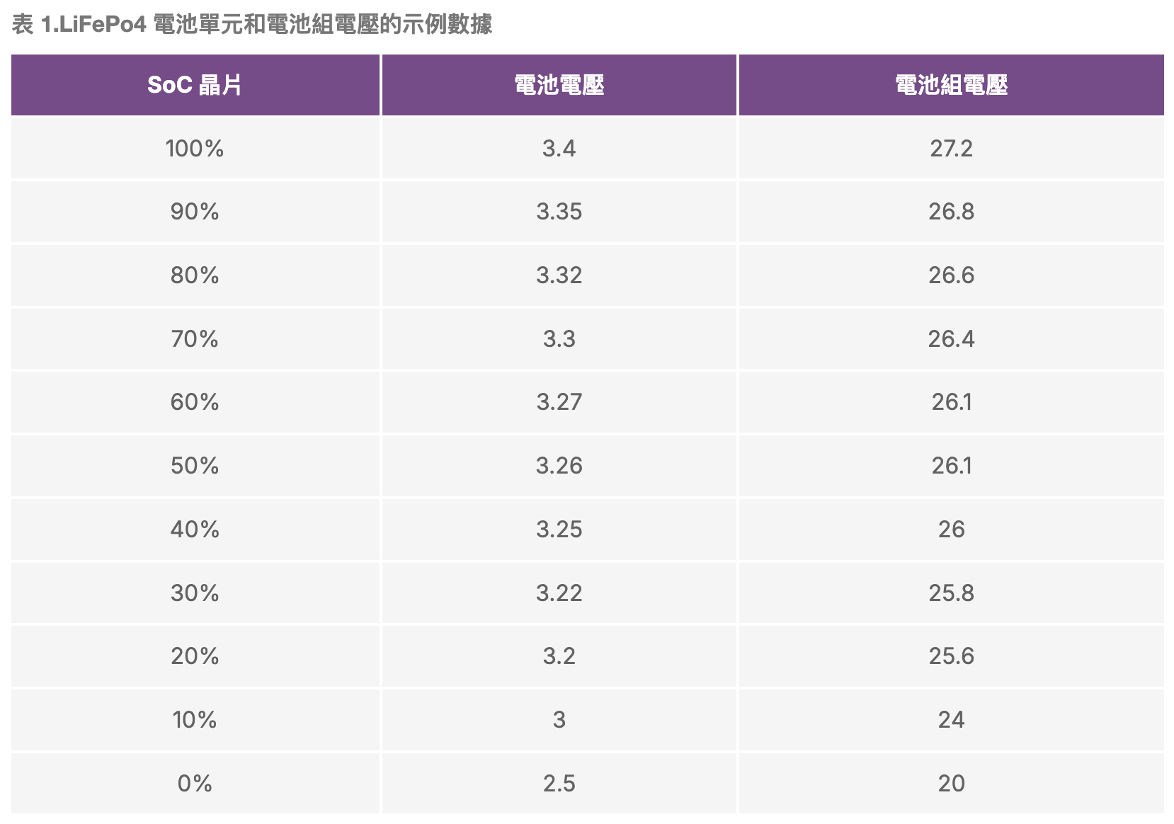 考慮到表 1,請注意,每節電池的電壓範圍為 350 mV,對於具有 8 節電池的 27.2 V 電池組,為 3.2 V。考慮到這一點,我們可以得出以下假設: