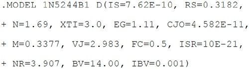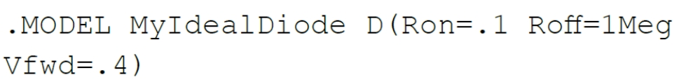 對於使用. MODEL 指令建立模型的元件,將這類模型匯入LTspice的流程相當簡單。 .MODEL 指令是一行代碼,包含模型名稱、元件類型和各項參數值。 有些模型可能相當簡單和理想化,例如:
