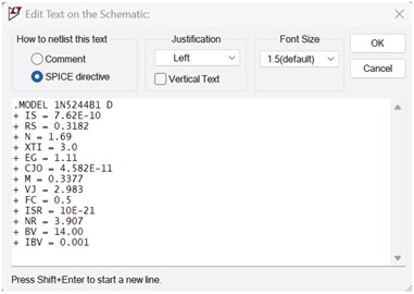 實現此目的的最簡單方法是,確保模型文本檔與原理圖位 於同一目錄中,然後使用. LIB 指令匯入檔案內容。 要添加. LIB 指 令,請從功能表中選擇Edit > SPICE Directive (編輯 > SPICE指令), 或鍵入. (句點) 調出 Edit Text on the Schematic (在原理圖編輯文字)對話方塊。 如果模型檔與原理圖檔位於相同目錄中,則可輸入. LIB <檔名>來匯入該檔內容。 對於此範例,檔名是1N5244B.txt。