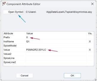 將.SUBCKT 模型連接到Q2,請 按住CTRL鍵並右鍵按兩下 Q2,以打開 Component Attribute Editor(元件屬性編輯器)。 將Value (值)更改為PSMN2R2-30YLC,,該值需與模型標頭中的子電路名稱相匹配。