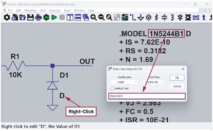 剛放置的元件,其預設值通常是佔位符 “D”。在 「Enter New Value(輸入新值)」 對話框中輸入模型名稱。在此範例中,模型名稱為 1N5244B1。