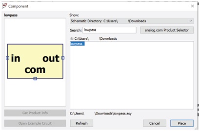 確保符號檔(.asy)和關聯的子電路檔(.cir)與原理圖檔(.asc)位於同一目錄下。 要將新符號放置到原理圖中,請鍵入P(或選擇Edit > Component(編輯 > 元件)),以打開Component (元件)對話框。 從目錄下拉功能表中選擇 Schematic Directory (原理圖目錄),然後選擇新創建的符號(圖12)。 按兩下 Place (放置),再按下原理圖以放置該符號。