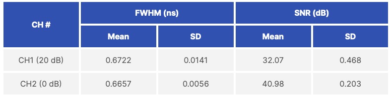 我們量測了所有輸入訊號衰減 1 dB 至 20 dB 的測試案例之 FWHM (半高全寬) 與 SNR (訊噪比)。結果彙總於表 2 (Table 2)。此結果顯示,在各種不同的輸入振幅 (input amplitudes) 下,FWHM 的讀值 (readout) 皆保持一致,這意味著 (suggested) 可實現精確的時間量測。