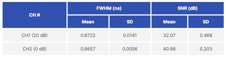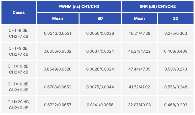 測量了輸入衰減從1 dB到20 dB的所有測試情況下的FWHM和SNR。測試結果總結列於表2中。結果顯示,在不同輸入幅度下,時間測量準確,FWHM讀數一致。