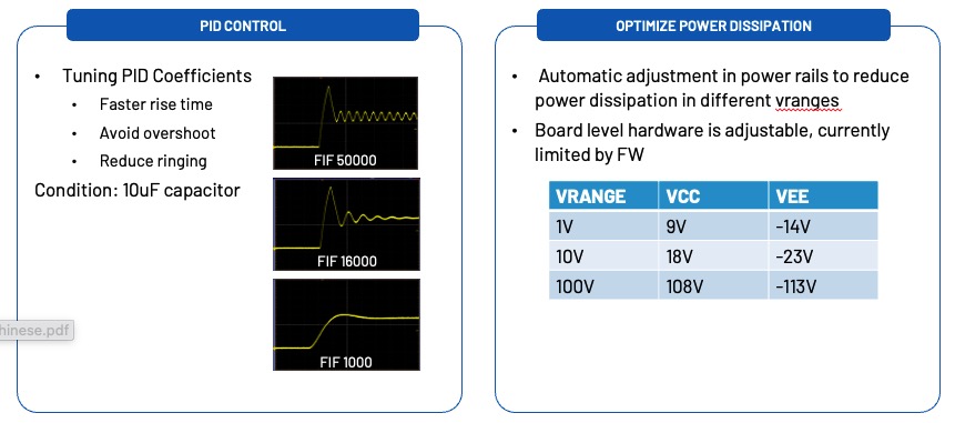 系統的整體方塊圖如圖15所示,其中最重要的三個元件是 ADC——AD4630-24、DAC——AD3552R 和高壓放大器 ADHV4711。AD4630-24 是一款 24 位元 (24-bit) 2Mbps SAR ADC,負責進行電壓和電流感測訊號的高精度採集,以確保系統的精確度;AD3552R 是一款雙通道 16 位元 (16-bit) 高精度快速 DAC,確保快速響應;ADHV4711 是一款高速高壓大電流(1A 220V)運算放大器,具備 1A 標稱輸出電流驅動能力,以及數位可編程故障偵測功能(OC、OV、OT)。