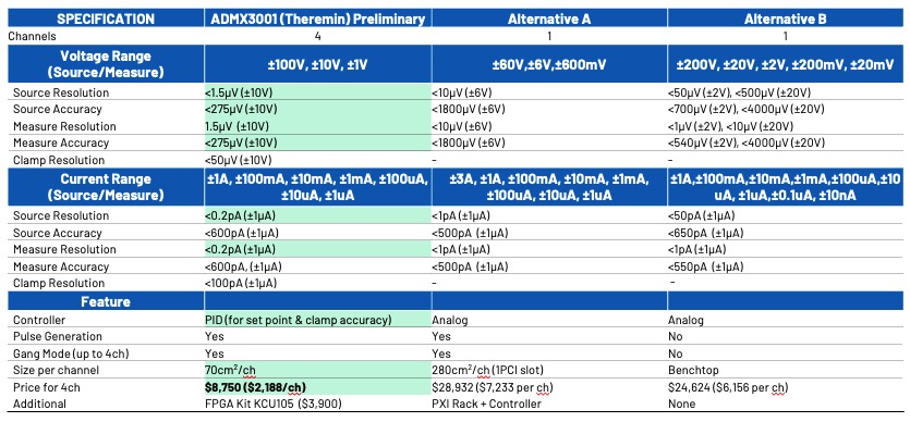 表 3 顯示 ADMX100X 相較於一般桌上型儀器的關鍵性能差異。