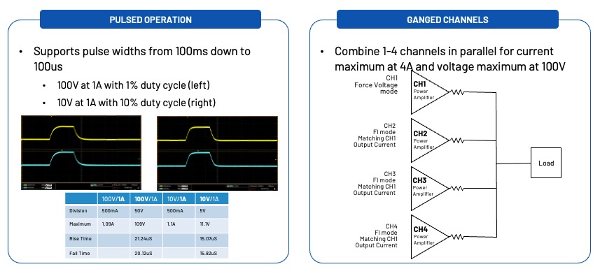 組合模式 (Gang Mode): 允許 1 至 4 個通道並聯,以增加電流和電壓驅動能力 。透過通道並聯,可實現最大 4A 的電流和最大 100V 的電壓 。這種模式對於需要更高功率的應用,或是同時測試大電流與電壓的元件特別有助益 。