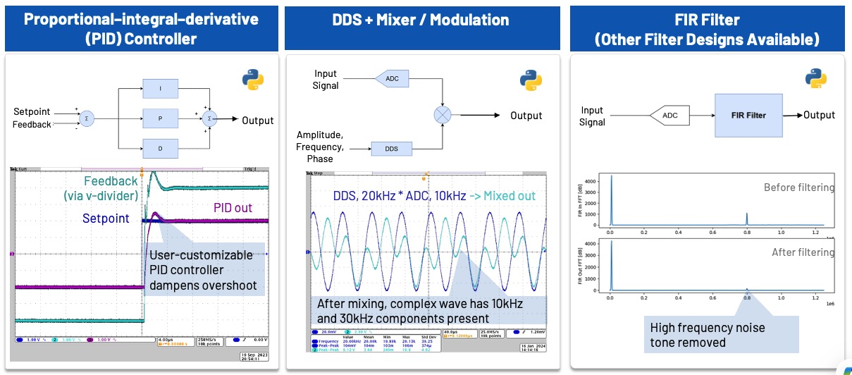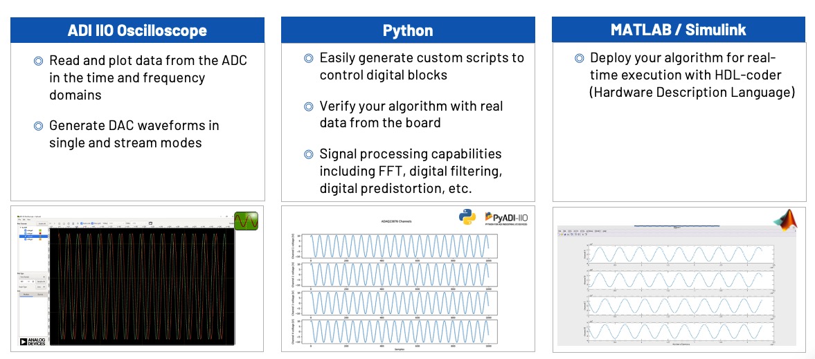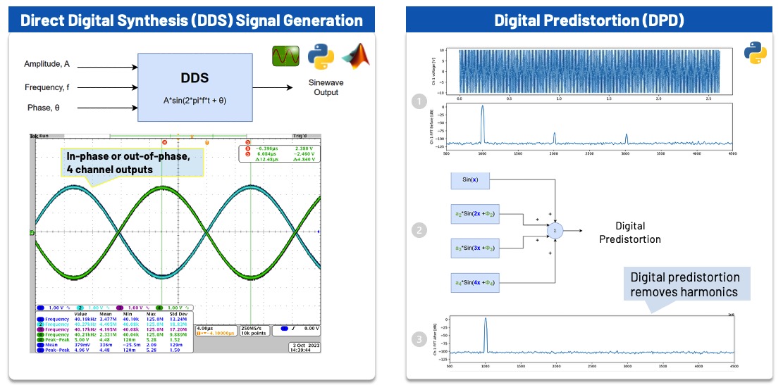 若需要更多自訂功能,例如生成不同頻率與振幅的正弦波,可使用 Python 腳本 控制。使用者也可以利用板上實際數據進行演算法驗證,並執行各種訊號處理,包括 FFT 濾波與數位預失真(Digital Predistortion, DPD)等演算法。