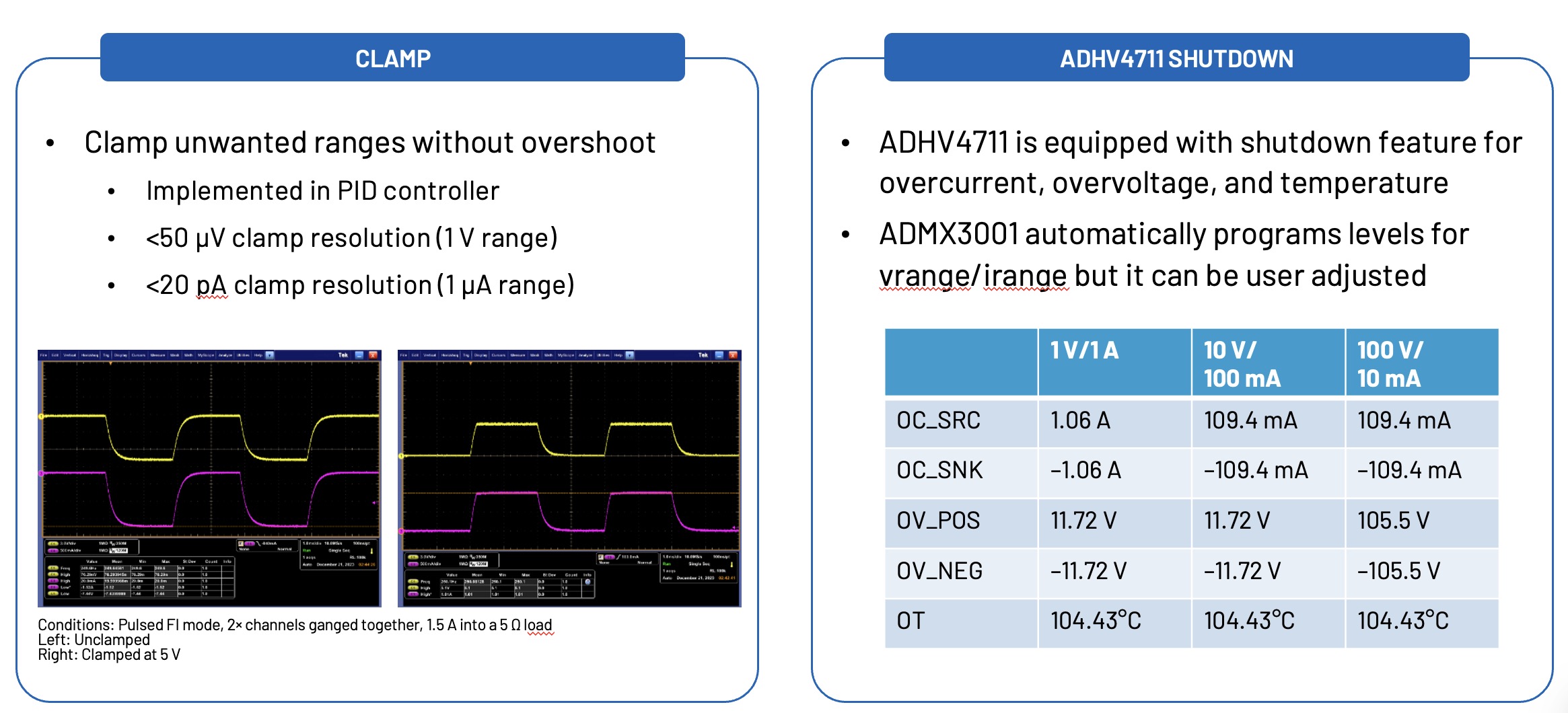 箝位功能允許使用者設定電壓和電流的特定限制,確保 ADMX3001 在操作過程中不會超過這些臨界值 (Threshold)。此功能有助於防止可能損壞敏感元件或 SMU 本身的意外過電壓或過電流情況。
