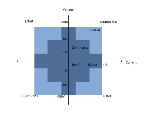 ADMX3001 配備四通道的 VI 源,每個功能通道可提供 ±100 V 的輸出,並支援三個電壓等級:±1 V、±10 V、±100 V;電流範圍則涵蓋 1 μA 至 1 A。整體板子尺寸為 5.5" × 10"(約 14 × 25 cm),緊湊設計並搭載數位 PID 控制器,可在各種負載下維持安全且穩定的操作。ADMX3001 支援完整四象限操作,如圖 13 所示。直流輸出可達 100 V、10 mA,脈衝輸出可達 100 V、1 A。使用者可依實際需求調整輸出電壓與電流範圍。四個通道可並聯使用,最大可提供 4 A 電流。為確保在嚴苛環境下的操作安全與可靠性,ADMX3001 內建多項保護機制,包括電壓/電流鉗位限制以及自動關機功能。