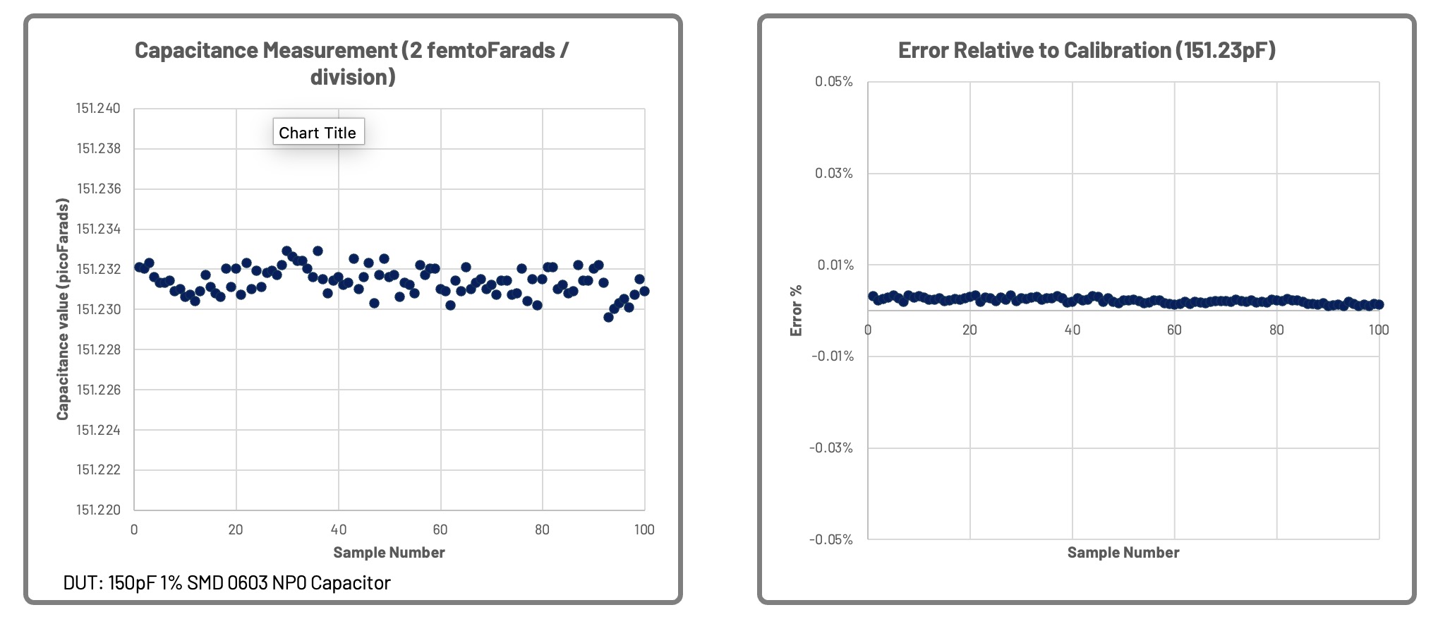 經過校準的150pF電容精度測試