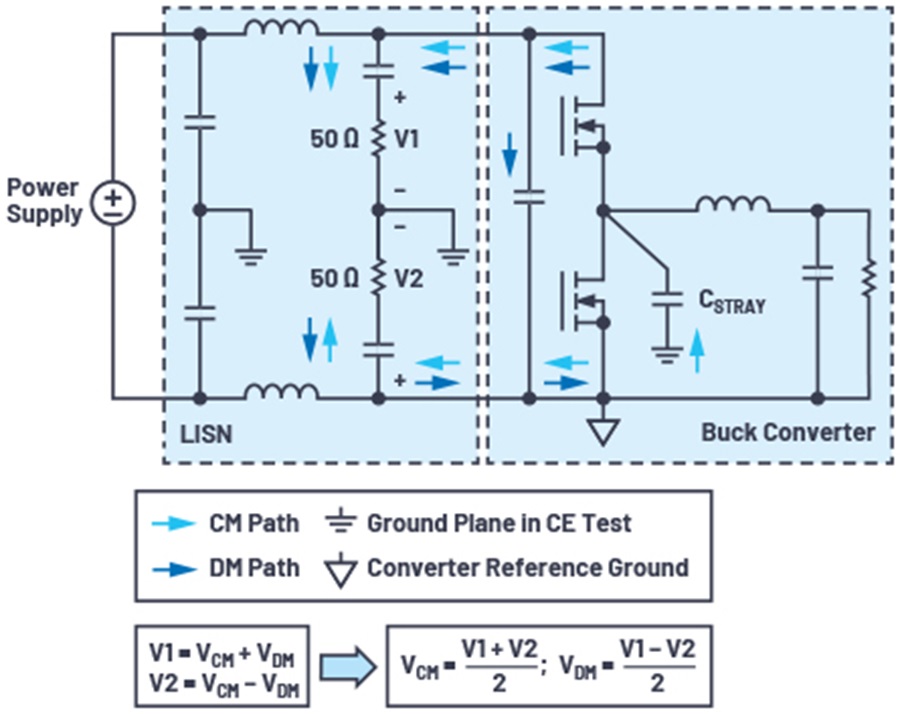 DM 雜訊在電源線和返回線之間產生,而 CM 雜訊是透過雜散電容 $C_{STRAY}$ 在電源線和接地參考平面(例如銅測試台)之間產生。$C_{STRAY}$ 實際上模擬了降壓轉換器輸出端的開關雜訊寄生效應。