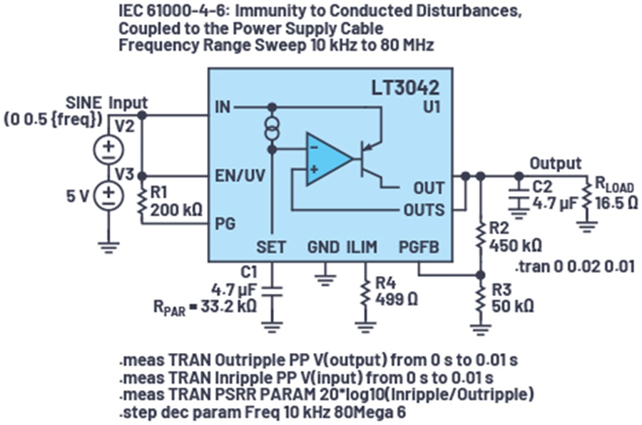 圖 18 含有幾個強大的語句。.meas 和 .step 語句的組合使用戶能夠在 LDO 輸入端添加電壓雜訊源,並在頻率範圍內測量電壓輸入階躍變化情況下的 LDO PSRR。