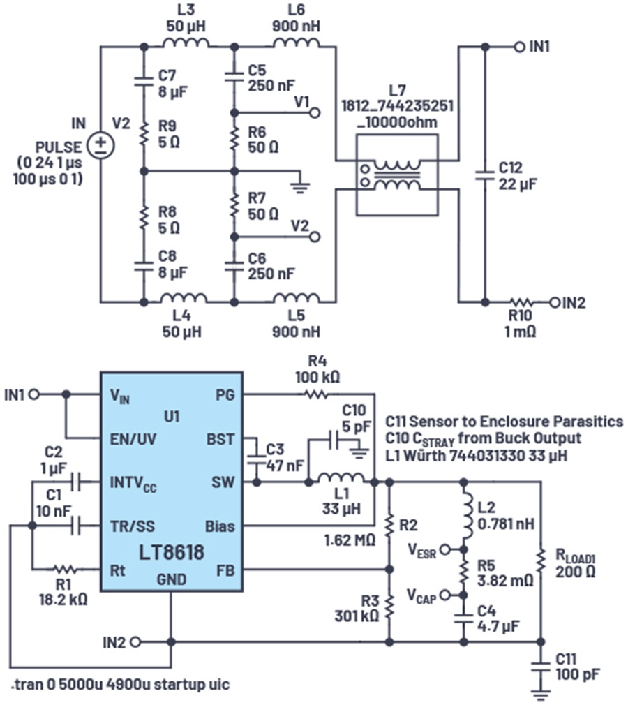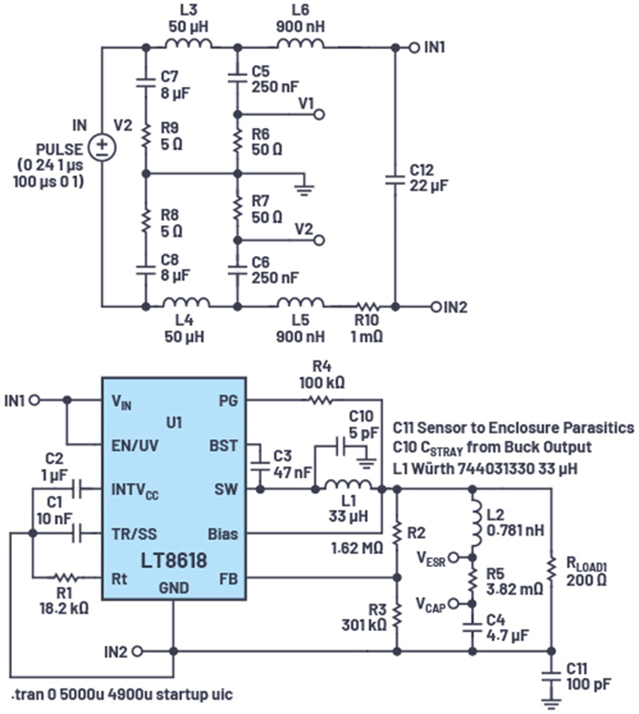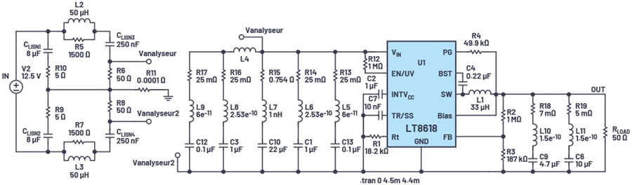 圖 7. LTspice LISN 電路、LT8618 降壓轉換器和寄生建模