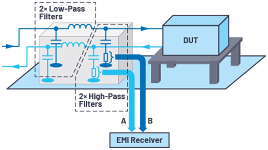 傳導輻射可分為兩類:共模 (CM) 雜訊和差模 (DM) 雜訊。區分 CM 和 DM 雜訊很重要,因為 EMI 緩解技術可能對 CM 雜訊有效,但對 DM 雜訊無效,反之亦然。由於 V1 和 V2 電壓同時輸出,因此在傳導輻射測試中可以使用 LISN 來分離 CM 和 DM 雜訊,如圖 6 所示。