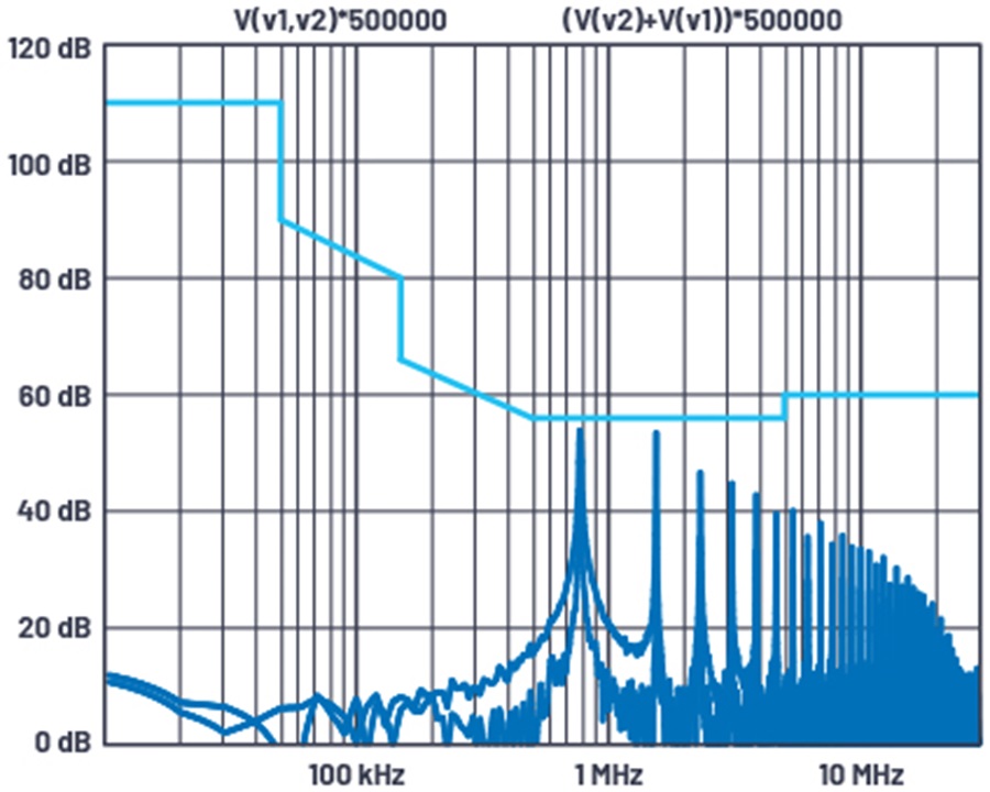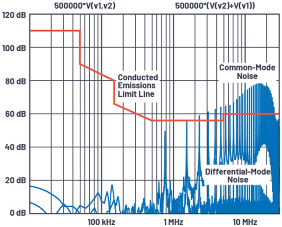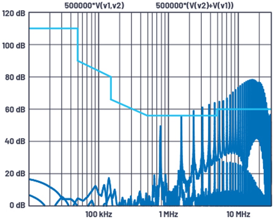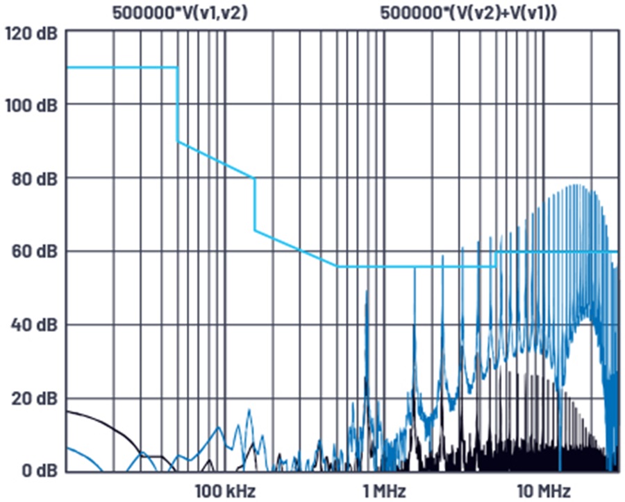 圖 1. 差模和共模雜訊的 LTspice圖,附有傳導輻射限值線