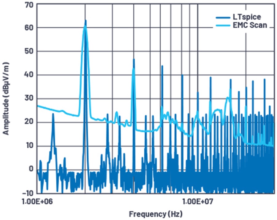 對圖 15 電路進行上述改變之後,圖 17 顯示了 LTspice 模擬與 EMC 實驗室中 DC2822A 展示板的實際測量的比較。LTspice 模擬模型非常準確地預測到實際實驗室輻射的主要峰值。