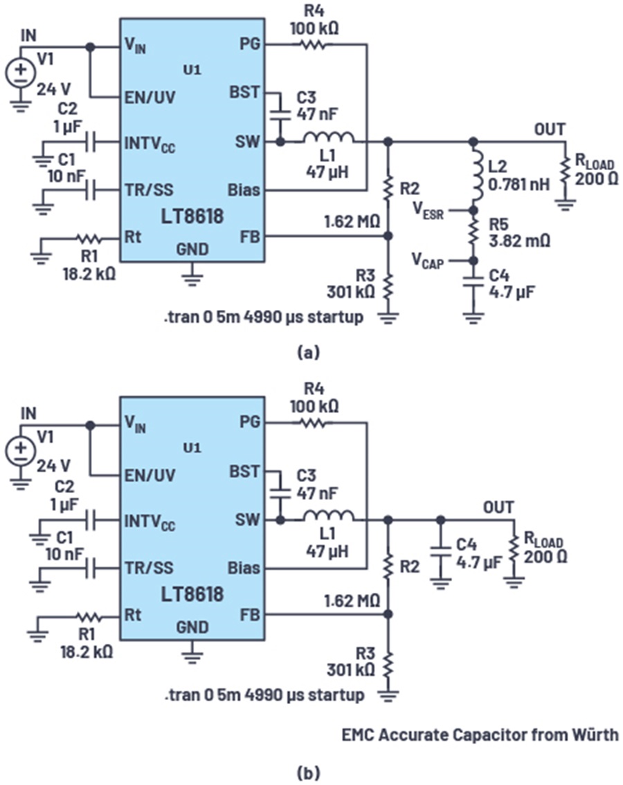 圖 3. LTspice 測試電路:(a) 使用 4.7 μF 電容以及分離的 ESL 和 ESR 值;(b) 使用包含 ESR 和 ESL 參數的 Würth 電容