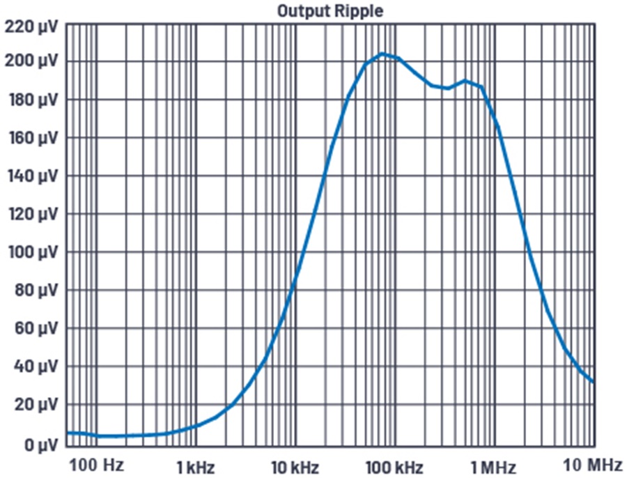 圖 20 顯示了頻率範圍內的輸出電壓漣波。在 50 Hz 至 10 MHz 範圍內,它小於 200 µV。在相同頻率範圍內,輸入電壓漣波為 1 V p-p。LT3042 為雜訊敏感的 MEMS 解決方案提供了出色的 PSRR 和低雜訊電源。