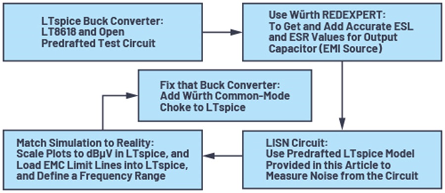 圖 2. 使用 LTspice 進行傳導輻射模擬的流程
