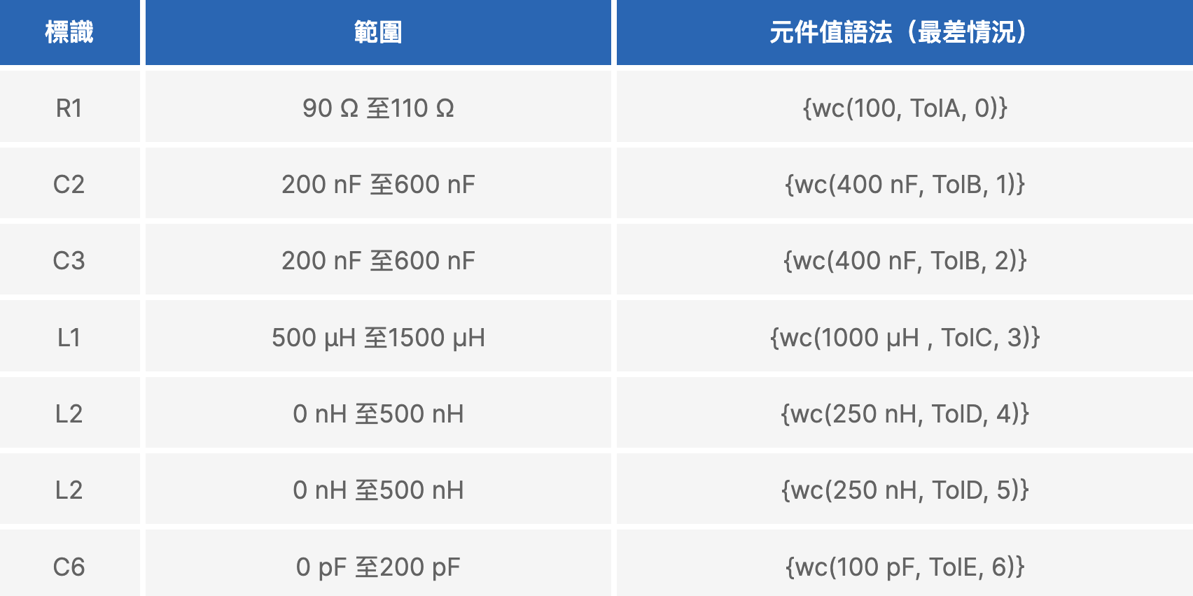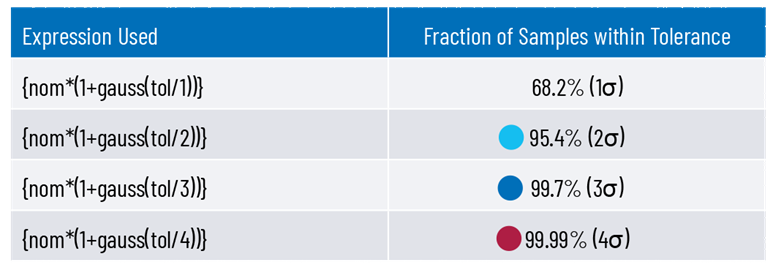 表 3. 使用高斯分佈方法定義元件值和容差